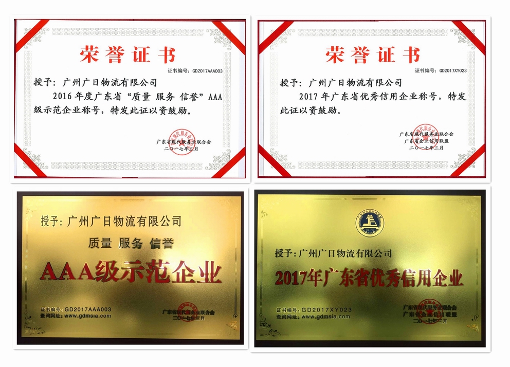 廣日物流榮獲“廣東省優秀信用企業”和“廣東省‘質量 服務 信譽’AAA級示范企業”稱號