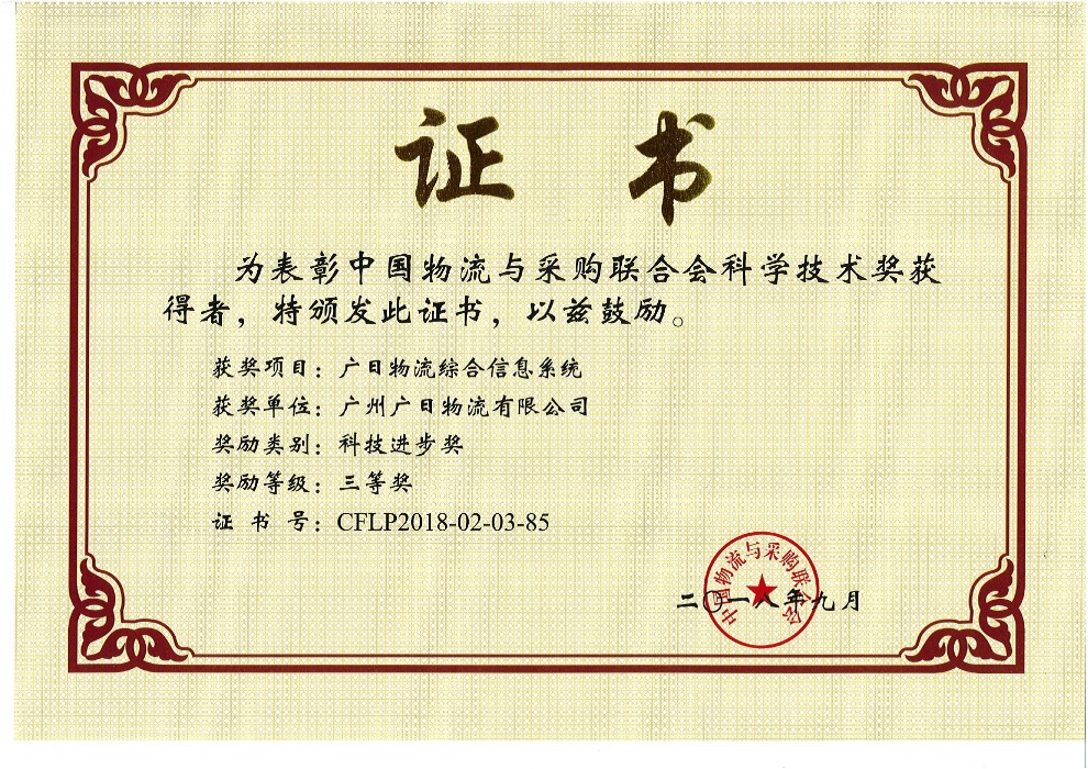 2018年9月27-29日,由中國物流與采購聯合會主辦的“第十一屆現代物流科技創新大會暨2018年度中國物流與采購聯合會科學技術獎頒獎大會”在重慶召開,廣日物流憑借 “廣日物流綜合信息系統” 榮膺中國物流與采購聯合會科技進步獎三等獎,這也是廣日物流連續7年榮獲該獎項。