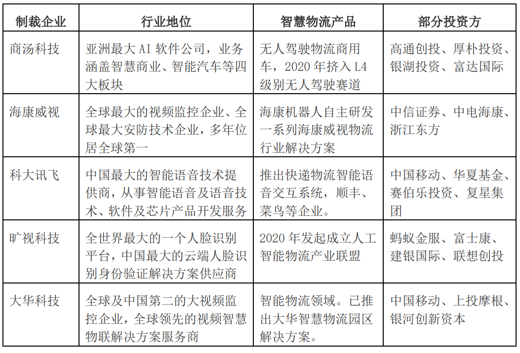 而12月10日,美國財政部把包括3名中國公民及商湯科技、大華科技、海康威視、科大訊飛、曠視科技等中國先進科技列入“制裁清單”,尤其對商湯科技實施限制投資。而掌鏈了解,五家科技都在智慧物流領域推出相關服務產品。