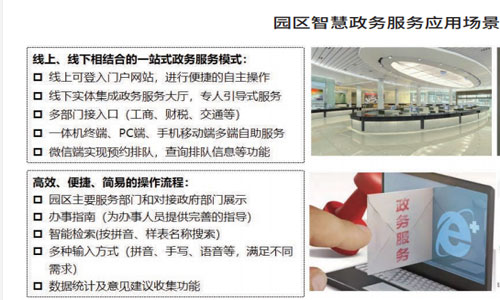 典型的園區智慧服務應用場景包括一站式政務服務、一體化的企業服務、智慧三產配套服務、數字化綜合能源服務、智能科技創新服務、智慧車后市場服務等。以一站式政務服務為例,借助互聯網技術,采取線上、線下相結合的服務模式,圍繞辦文、辦會、辦事和信息公開等,全面實現園區政務服務工作的數字化和便利化。