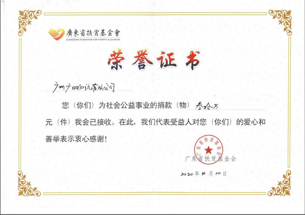 為助力精準扶貧、弘揚慈善文化,2019年4月,廣州廣日物流有限公司參加廣東省扶貧基金會扶貧募捐活動,捐款金額為叁拾萬元。廣東省教育基金會向廣日物流頒發了榮譽證書以表感謝。