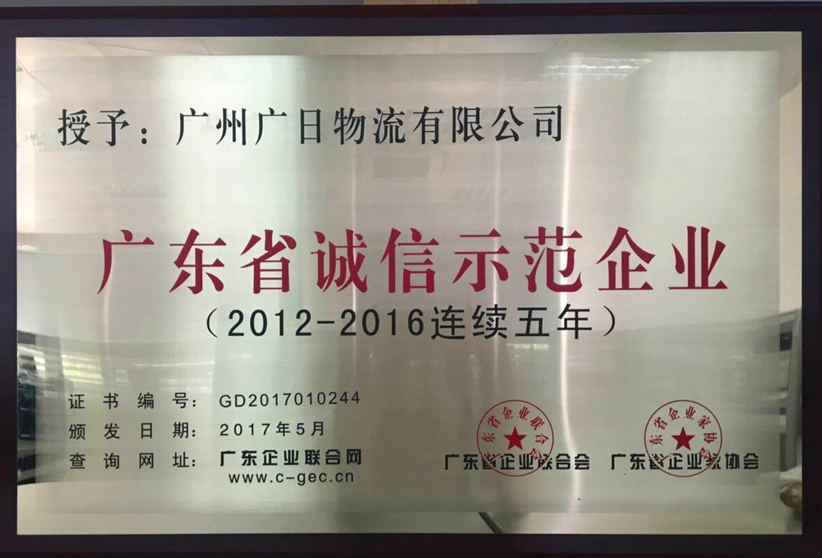 廣日物流連續(xù)五年被評(píng)為“廣東省誠(chéng)信示范企業(yè)”。